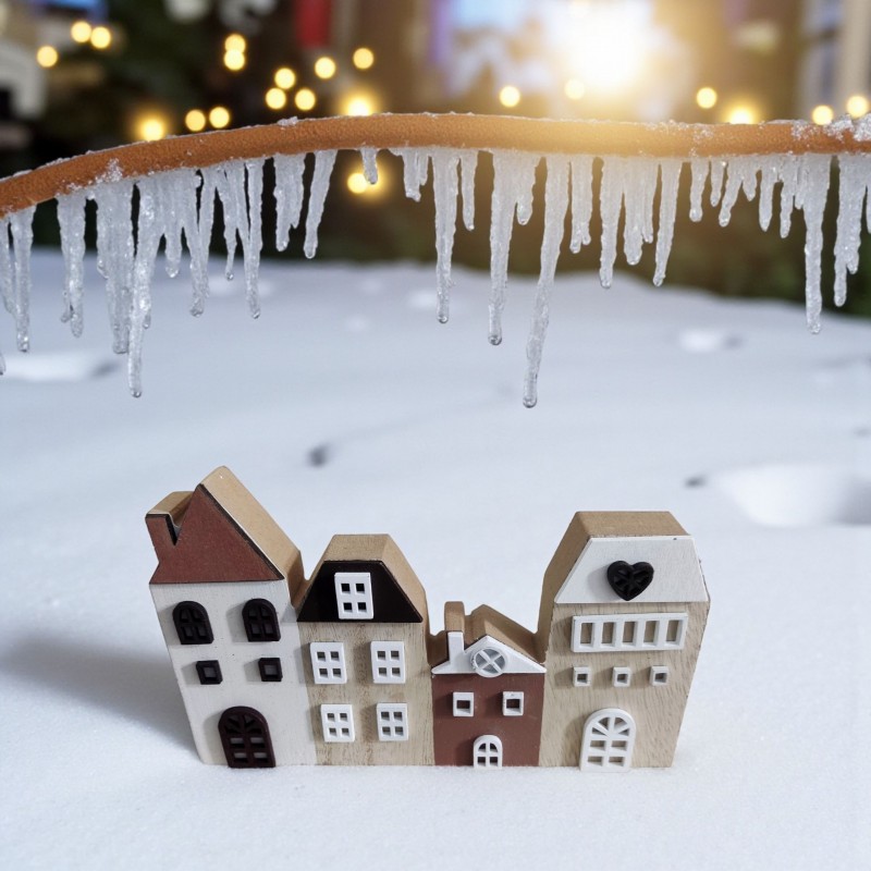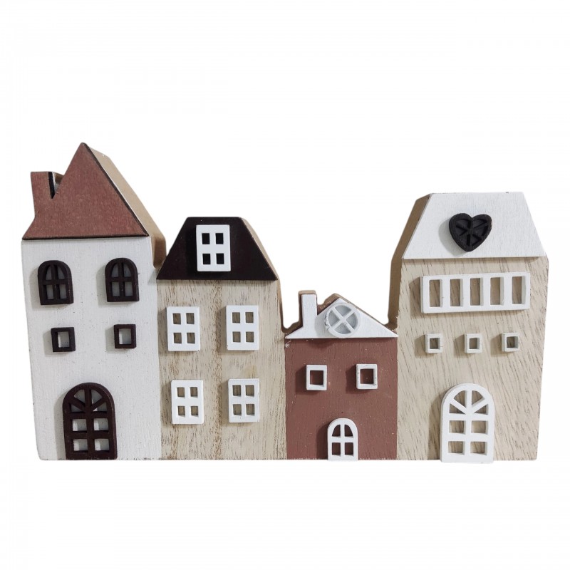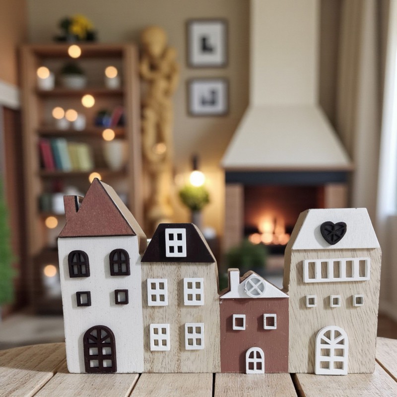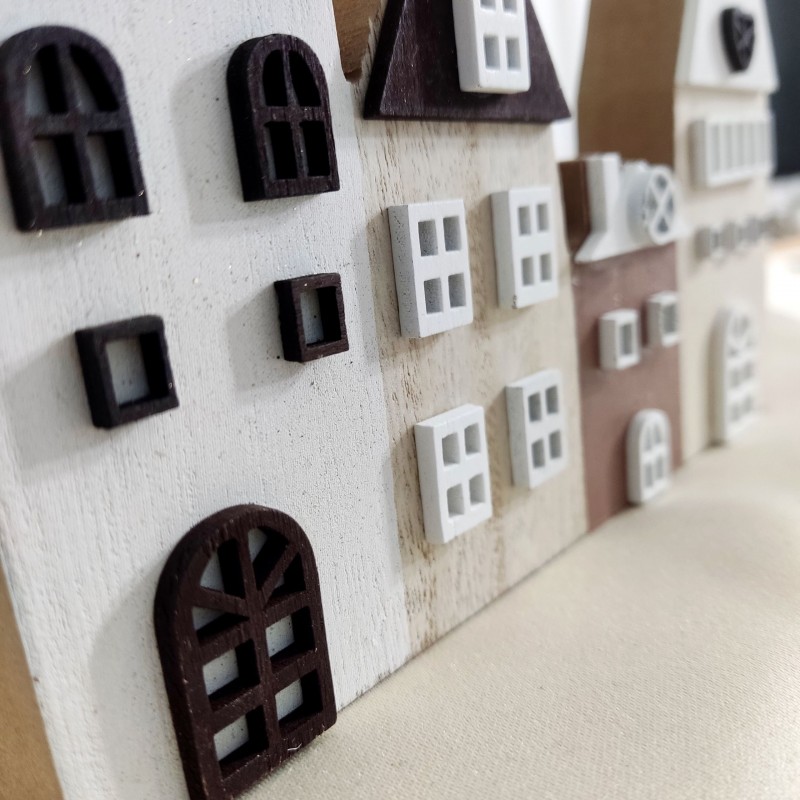 Piękne, precyzyjnie wycięte z drewna domki, imitacja miasta, makieta - sprawdzi się przy tworzeniu dekoracji w mieszkaniu. Makieta składa się z 4 domków. Domki posiadają naklejone okna co sprawia że ozdoba jest przestrzenna. Doskonały element wystroju wnętrza - salon, przedpokój, ale nie tylko, dzięki tej ozdobie możesz własnoręcznie wykonać ciekawy stroik czy świecznik.