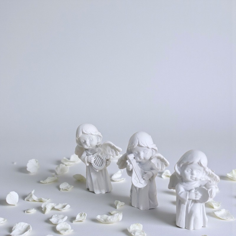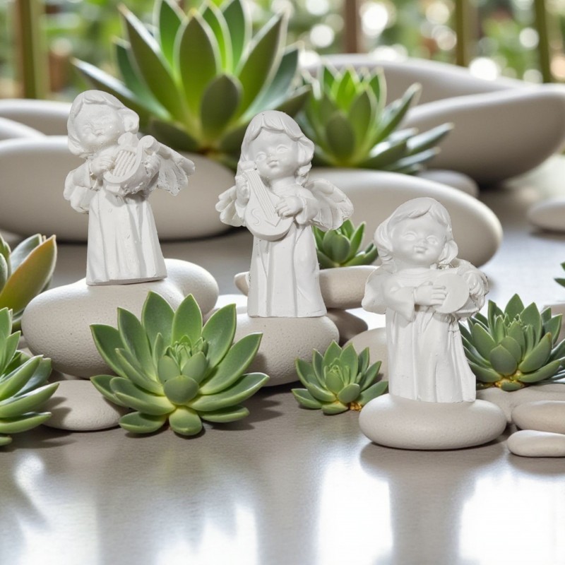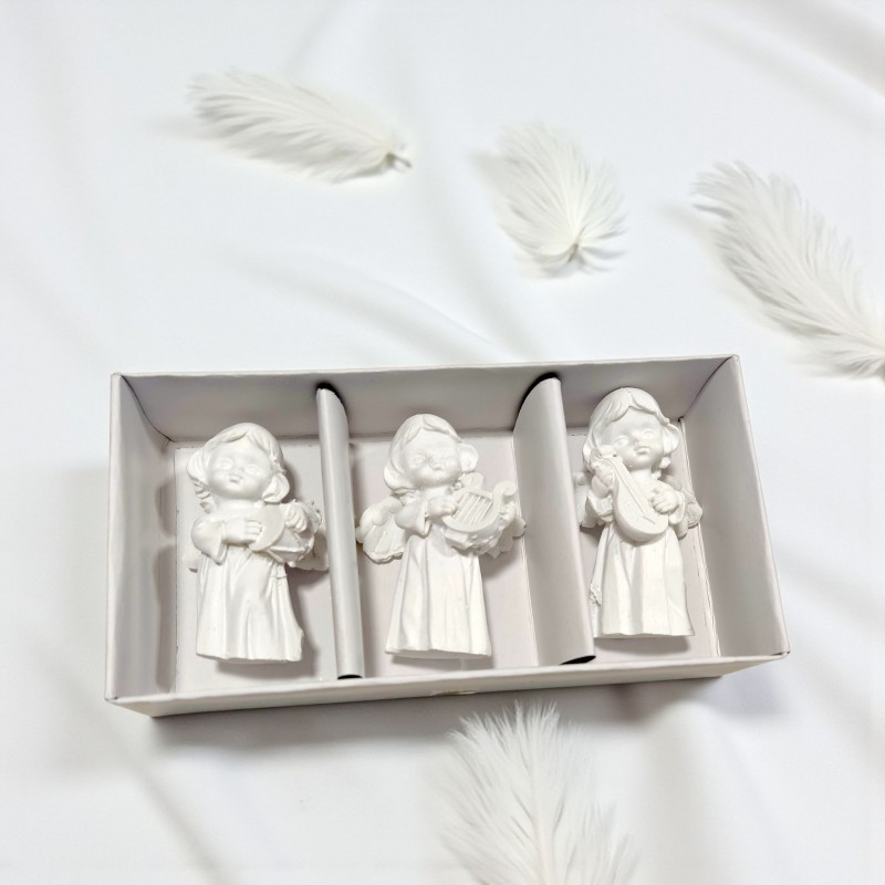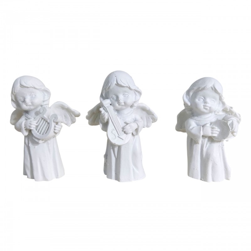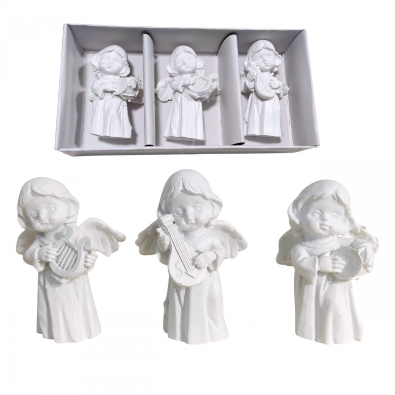 Śliczna, delikatna, wykonana w precyzyjny sposób ozdoba doskonała jako element ozdobny dekoracji sporządzanej w okresie bożonarodzeniowym. Każdy aniołek trzy instrument - bębenek, harfę i mandolinę. Idealne do stroika, wianka, szopki, kuli akrylowej.Figurka idealna do pomalowania, pomysł na prezent.