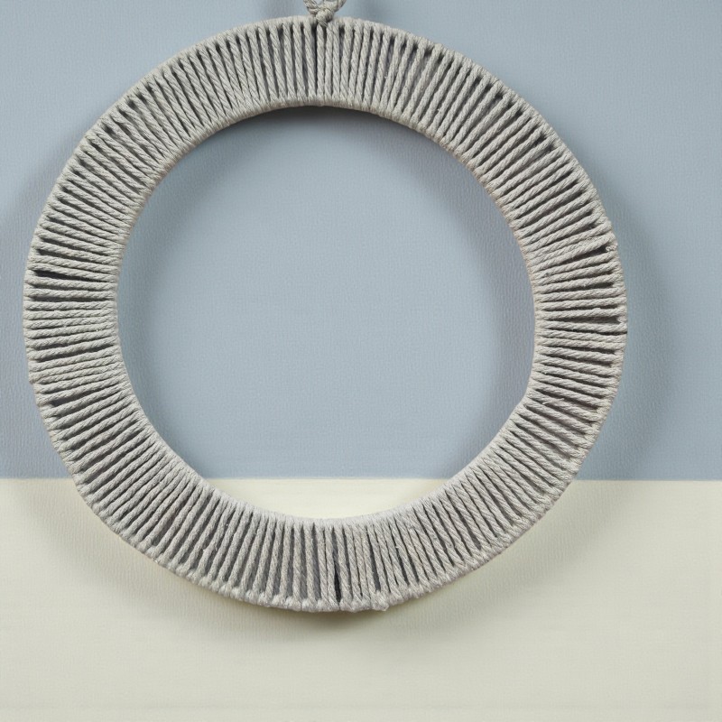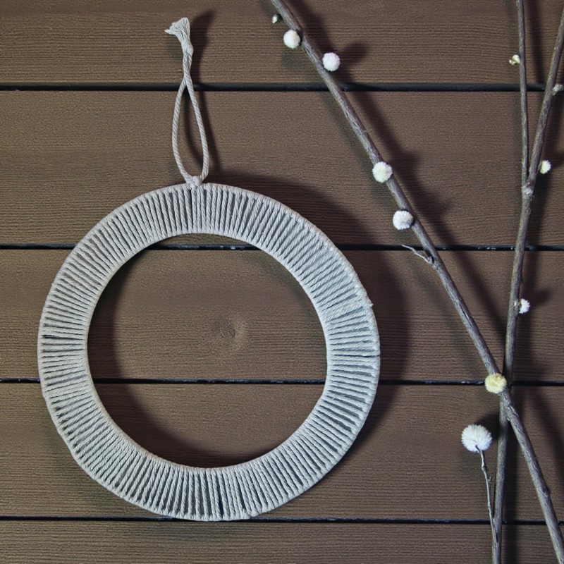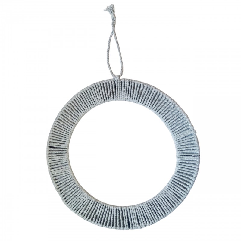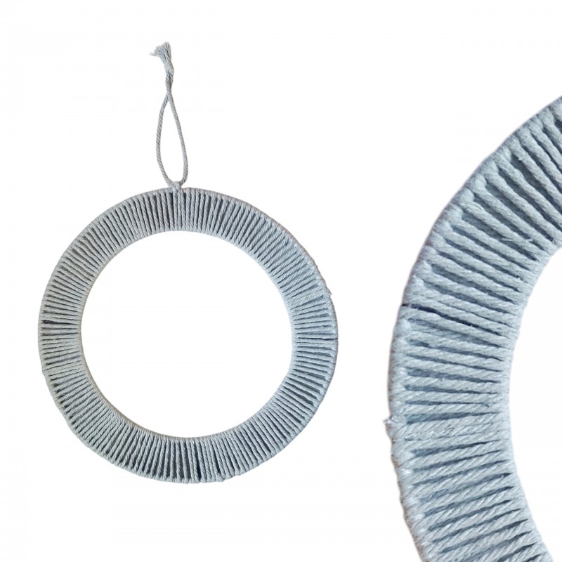Obręcz jest metalowa opleciona sznurkiem skręcanym, na górze posiada zawieszkę co ułatwi mocowanie dekoracji.