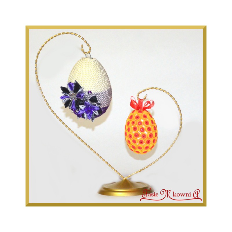 Efektowny, wysoki, ozdobny stojak na samodzielnie przystrojone styropianowe jajka. Wykonana dekoracja umieszczona na stojaku wygląda niezwykle.Jajka można umieścić bezpośrednio na haczyku stojaka bądź na zawieszce umieszczonej wcześniej w dekoracji.