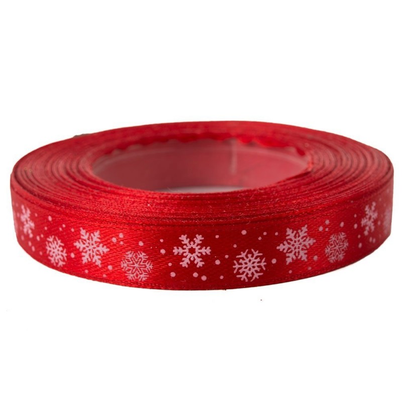 Tasiemka SATYNOWA czerwona ŚNIEŻYNKI 12mm/23mb